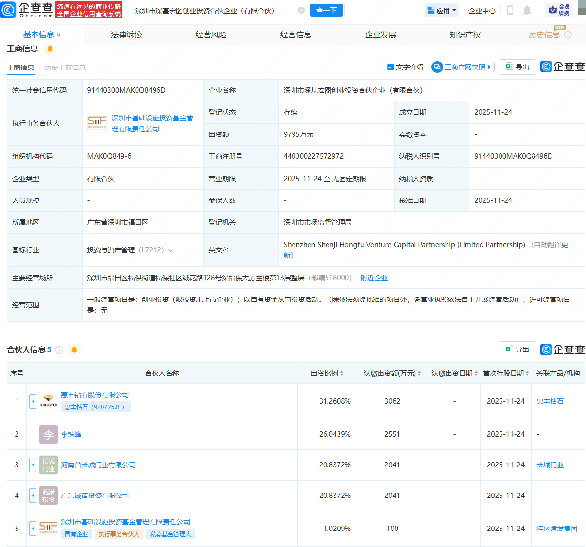 股票配资公司网站官网 惠丰钻石等在深圳成立创投合伙企业